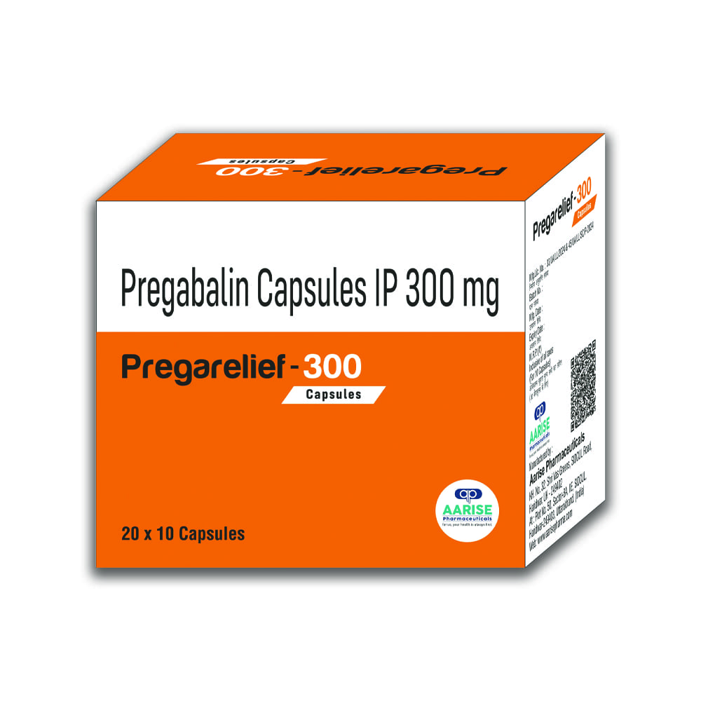 Pregarelief 300 is an antiepileptic medication. When given for epilepsy, it is believed to work by reducing the abnormal electrical activity in the brain, this preventing seizures. It is also used to treat nerve pain where it blocks pain by interfering with pain signals travelling through the damaged nerves and the brain. For treatment of anxiety, it is believed to work by stopping the release of certain chemical messengers that make you feel anxious. Pregarelief-300 Capsules by Aarise Pharmaceuticals contain Pregabalin IP 300 mg, a trusted medication for the effective management of neuropathic pain, fibromyalgia, and certain seizure disorders. By calming overactive nerve signals, it helps reduce pain, improve sleep quality, and enhance daily comfort. Manufactured under strict pharmaceutical guidelines, Pregarelief-300 ensures high safety, consistent efficacy, and reliable relief under medical supervision.